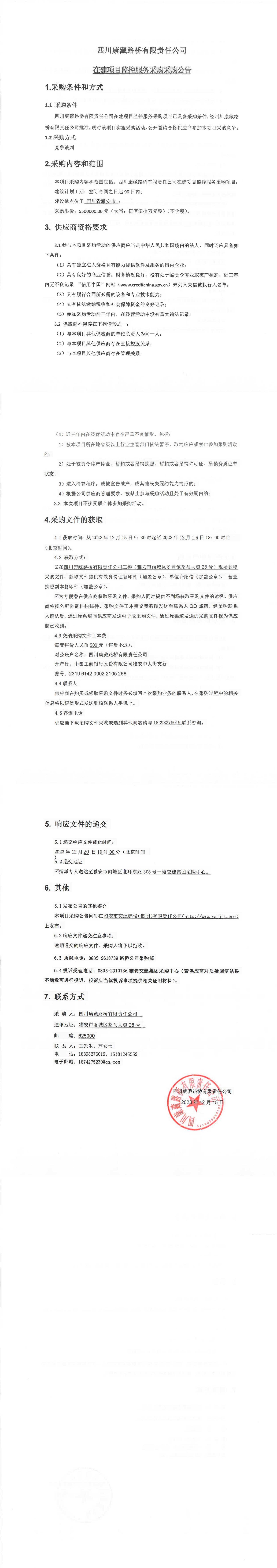 四川康藏路桥有限责任公司在建项目监控服务采购公告