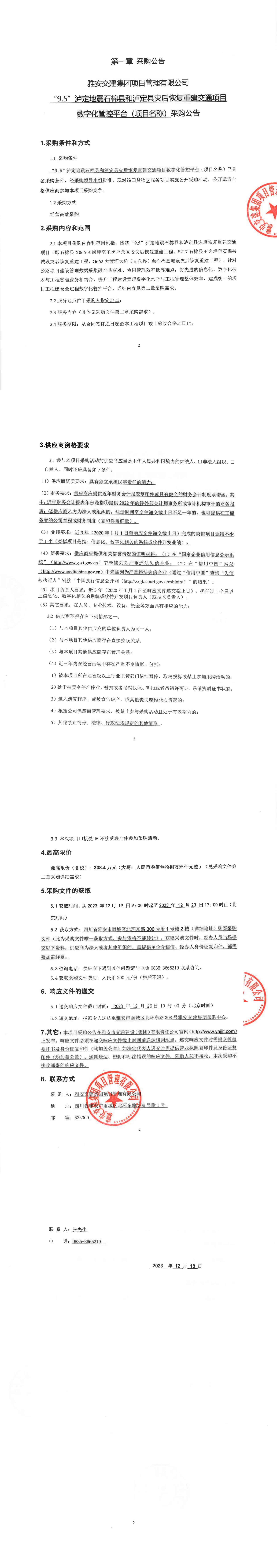 米兰体育-米兰(中国)官网 项目管理有限公司“9.5”泸定地震石棉县和泸定县灾后恢复重建交通项目数字化管控平台(项目名称)采购公告