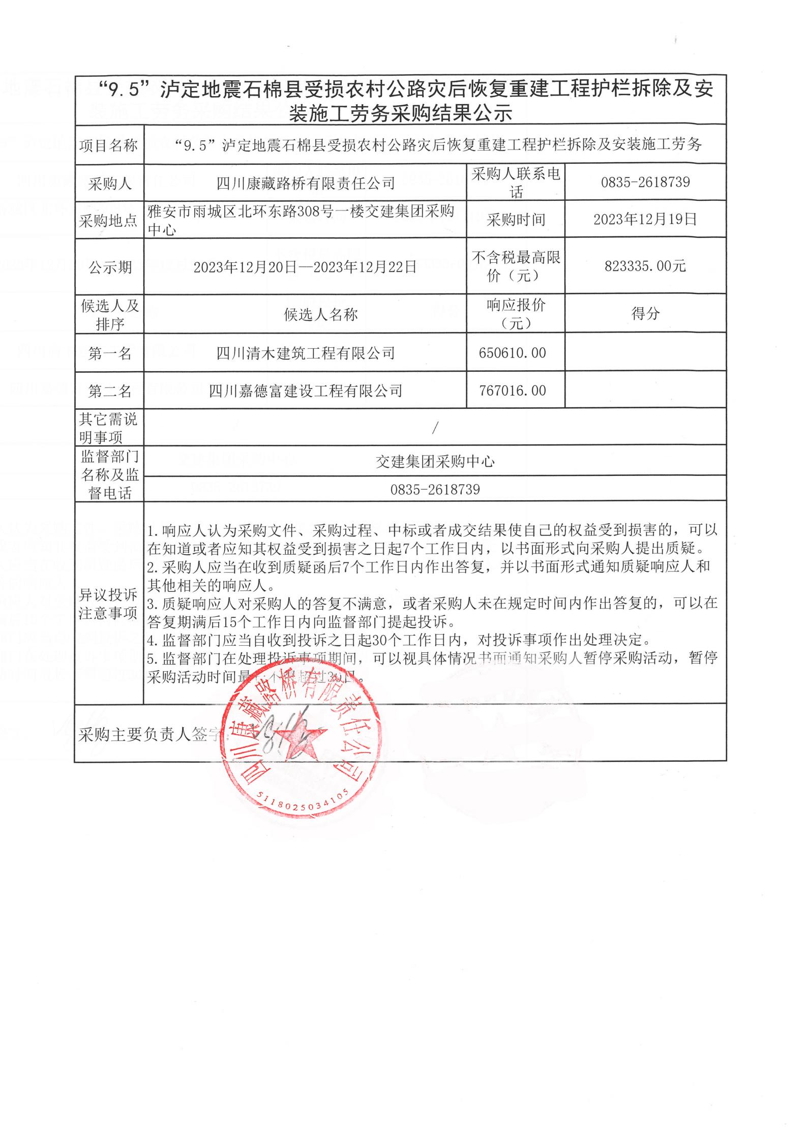 四川康藏路桥有限责任公司“9.5”泸定地震石棉县受损农村公路灾后恢复重建工程护栏拆除及安装施工劳务采购结果公示
