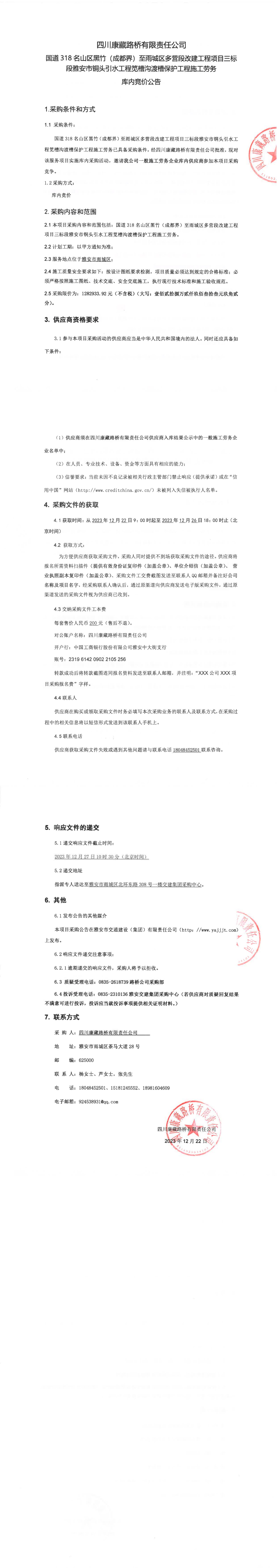 四川康藏路桥有限责任公司国道318名山区黑竹(成都界)至雨城区多营段改建工程项目三标段雅安市铜头引水工程笕槽沟渡槽保护工程施工劳务库内竞价公告