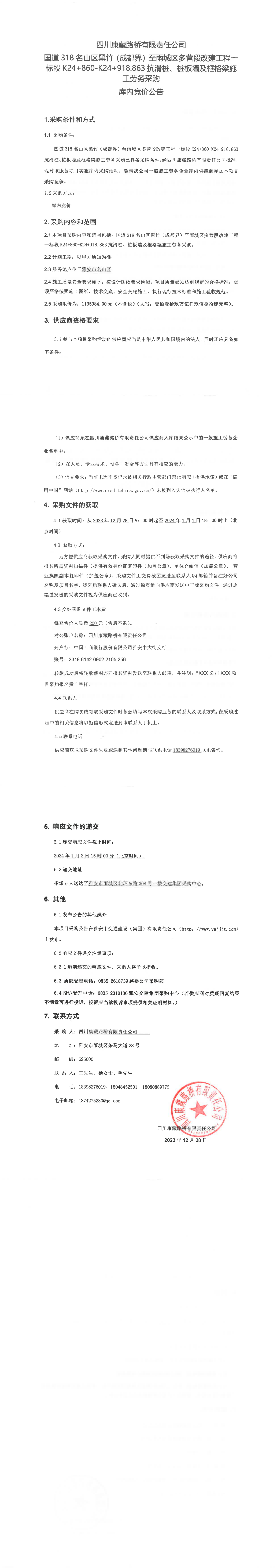 四川康藏路桥有限责任公司国道318名山区黑竹(成都界)至雨城区多营段改建工程一标段K24+860-K24+918.863抗滑桩、桩板墙及框格梁施工劳务采购库内竞价公告