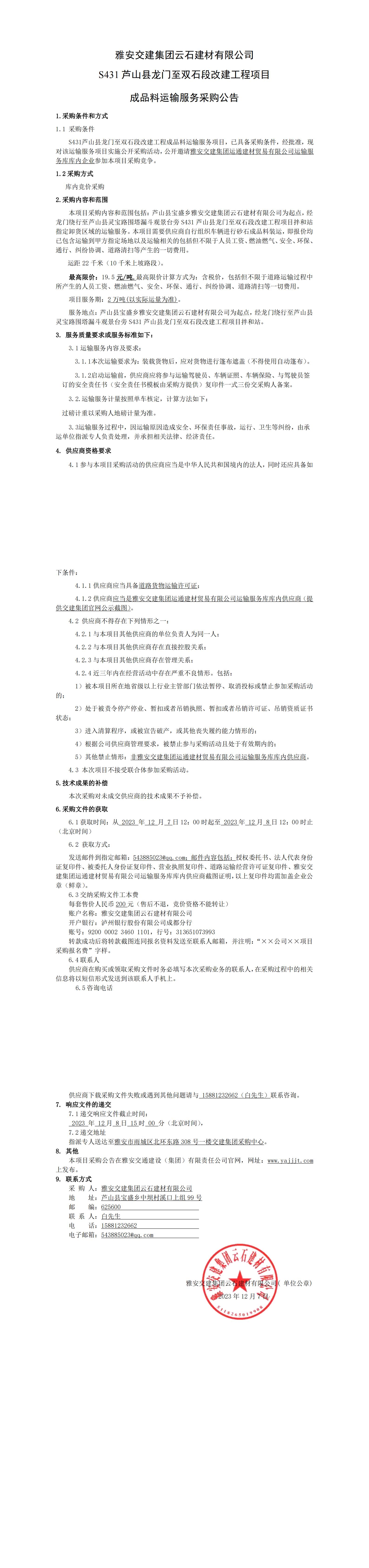 米兰体育-米兰(中国)官网 云石建材有限公司S431芦山县龙门至双石段改建工程项目成品料运输服务采购公告