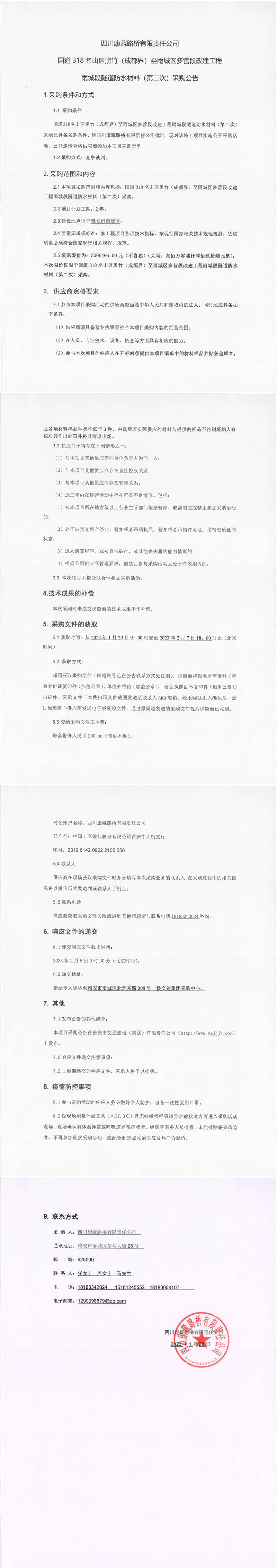 四川康藏路桥有限责任公司国道318名山区黑竹(成都界)至雨城区多营段改建工程雨城段隧道防水材料(第二次)采购公告