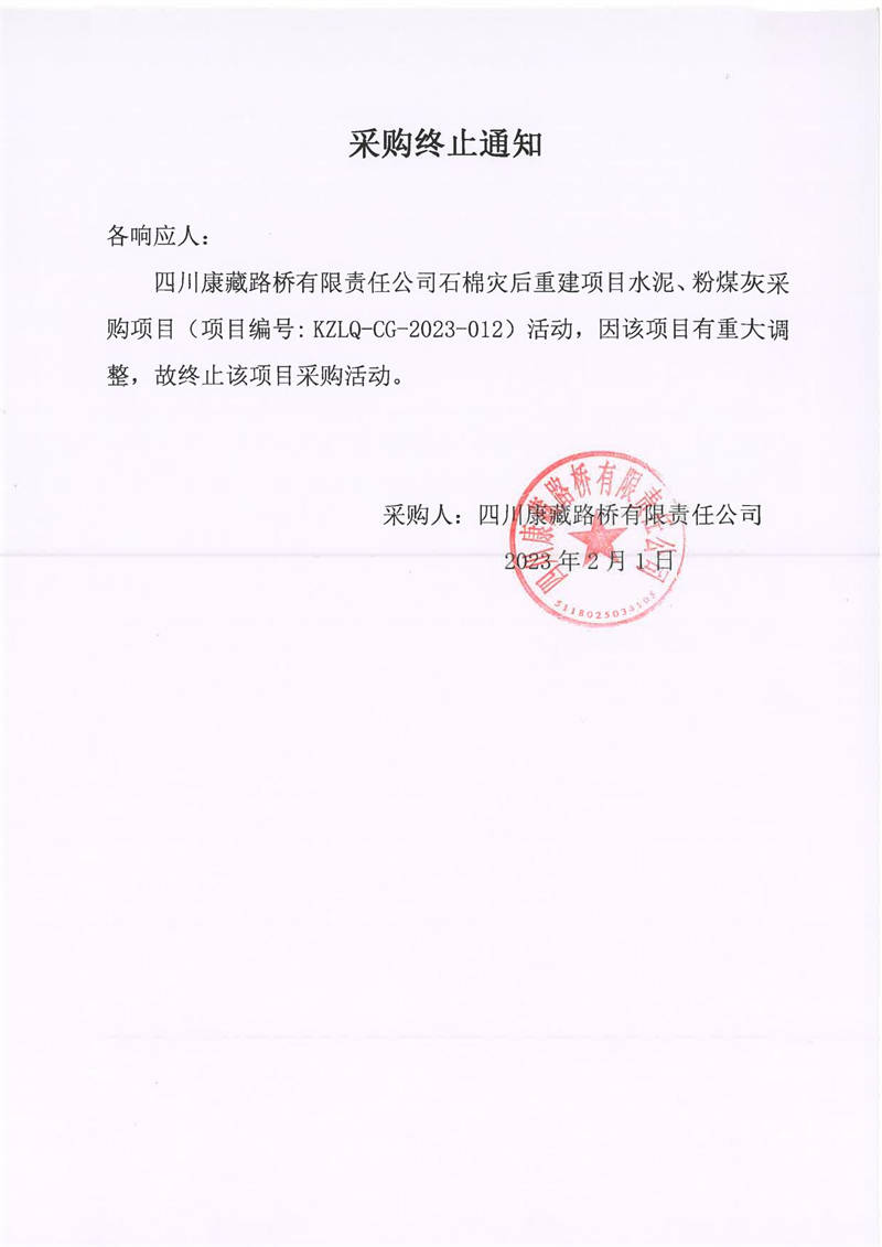 四川康藏路桥有限责任公司石棉灾后重建项目水泥、粉煤灰采购项目采购终止通知