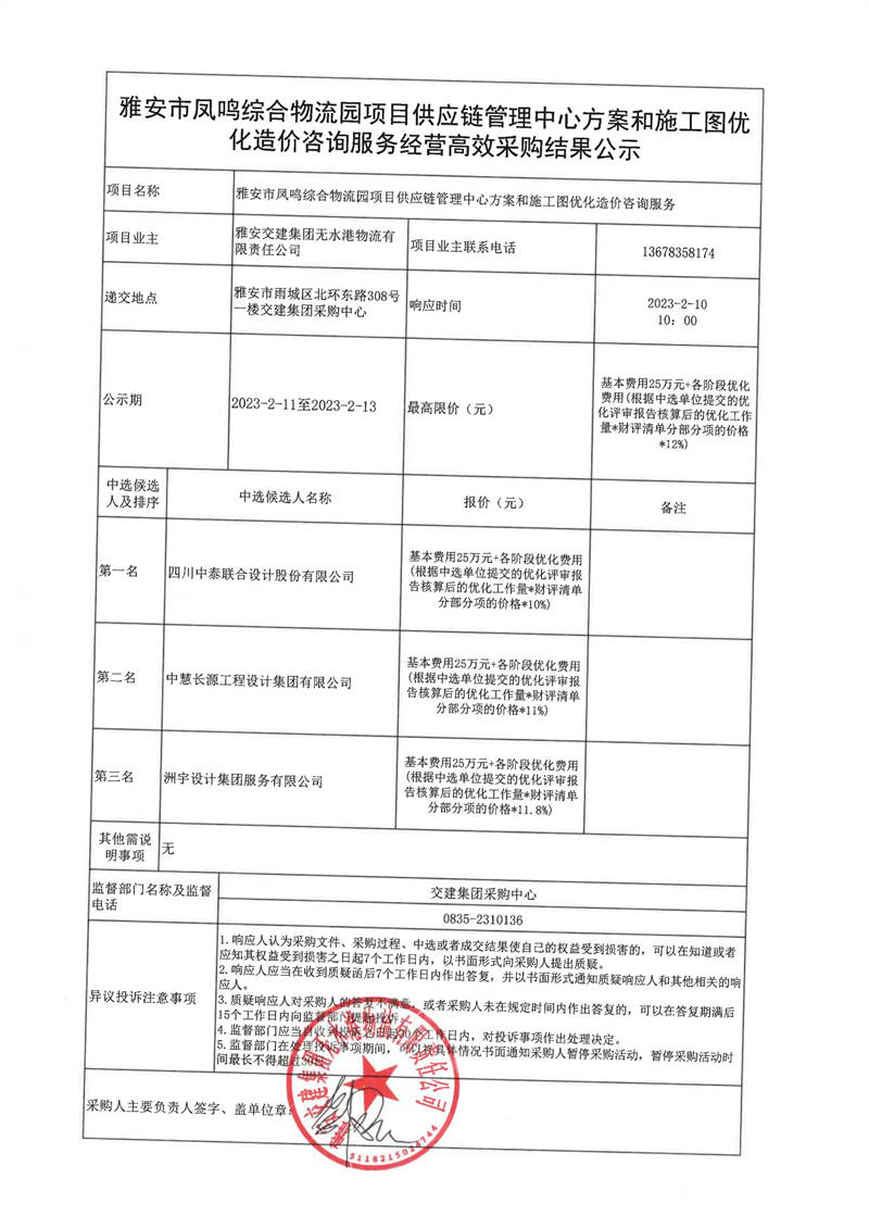 米兰体育-米兰(中国)官网 无水港物流有限责任公司雅安市凤鸣综合物流园项目供应链管理中心方案和施工图优化造价咨询服务经营高效采购结果公示