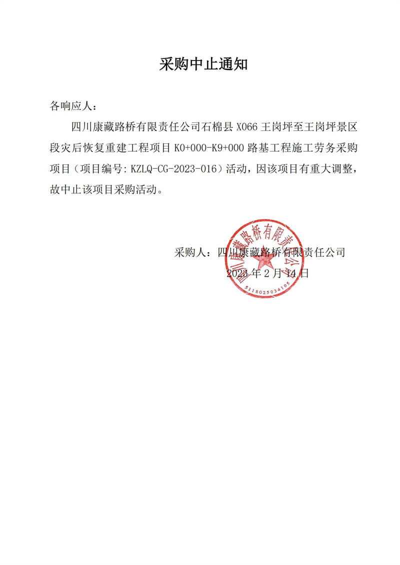 四川康藏路桥有限责任公司石棉县X066王岗坪至王岗坪景区段灾后恢复重建工程项目K0+000-K9+000路基工程施工劳务采购中止公告