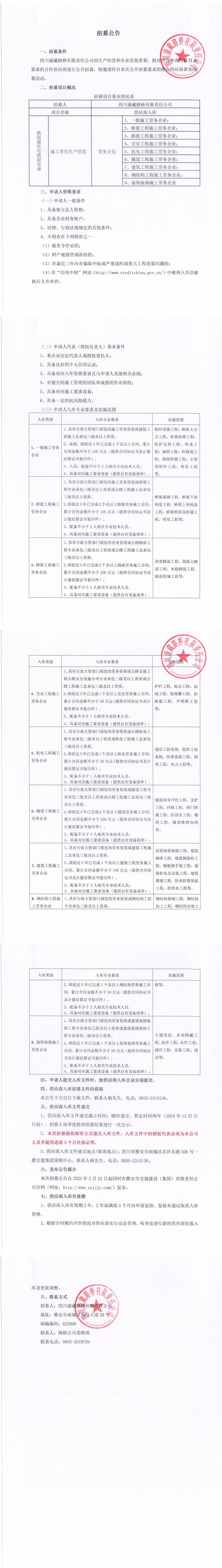 四川康藏路桥有限责任公司2023年供应商入库(施工单位生产经营劳务分包)招募公告