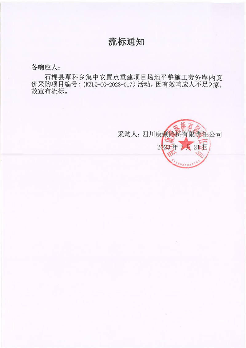 四川康藏路桥有限责任公司石棉草科乡集中安置点重建项目场地平整施工劳务库内竞价流标通知