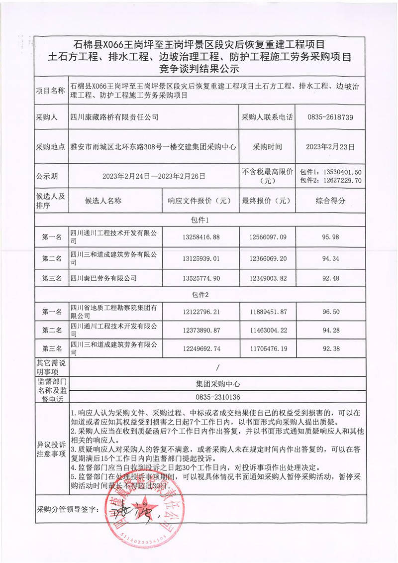 四川康藏路桥有限责任公司石棉县X066王岗坪至王岗坪景区段灾后恢复重建工程项目土石方工程、排水工程、边坡治理工程、防护工程施工劳务采购项目竞争谈判结果公示