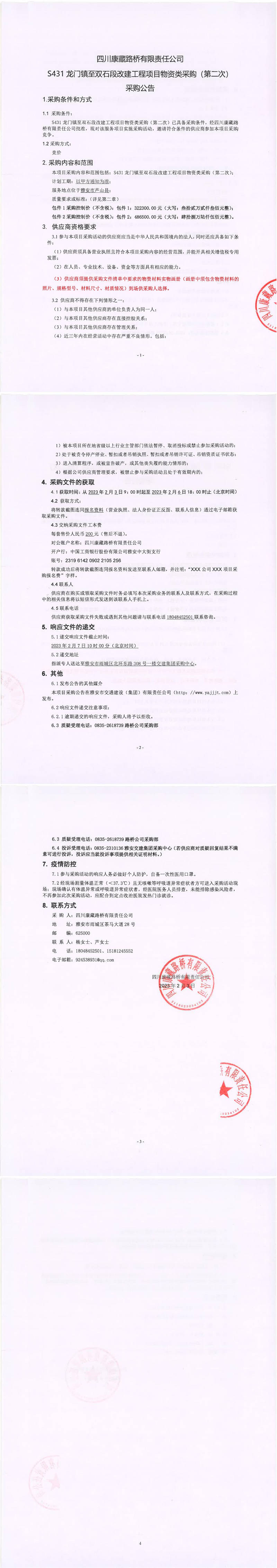 四川康藏路桥有限责任公司S431龙门镇至双石段改建工程项目物资类采购(第二次)采购公告
