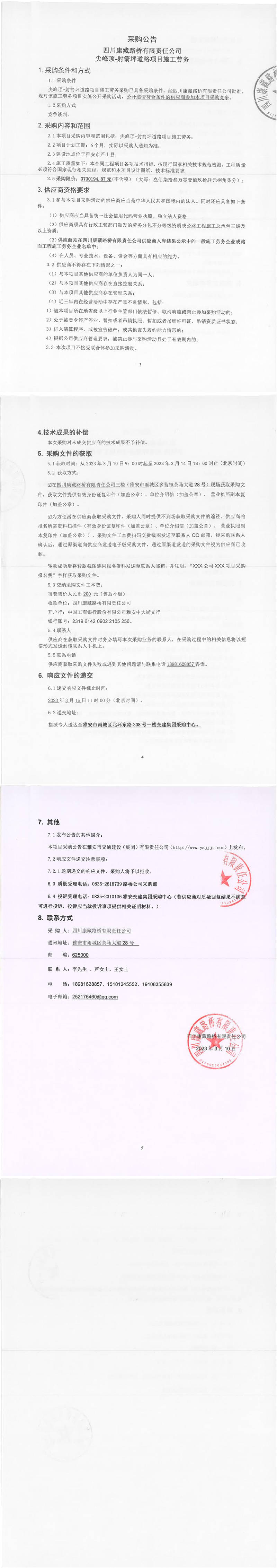 四川康藏路桥有限责任公司尖峰顶-射箭坪道路项目施工劳务采购公告