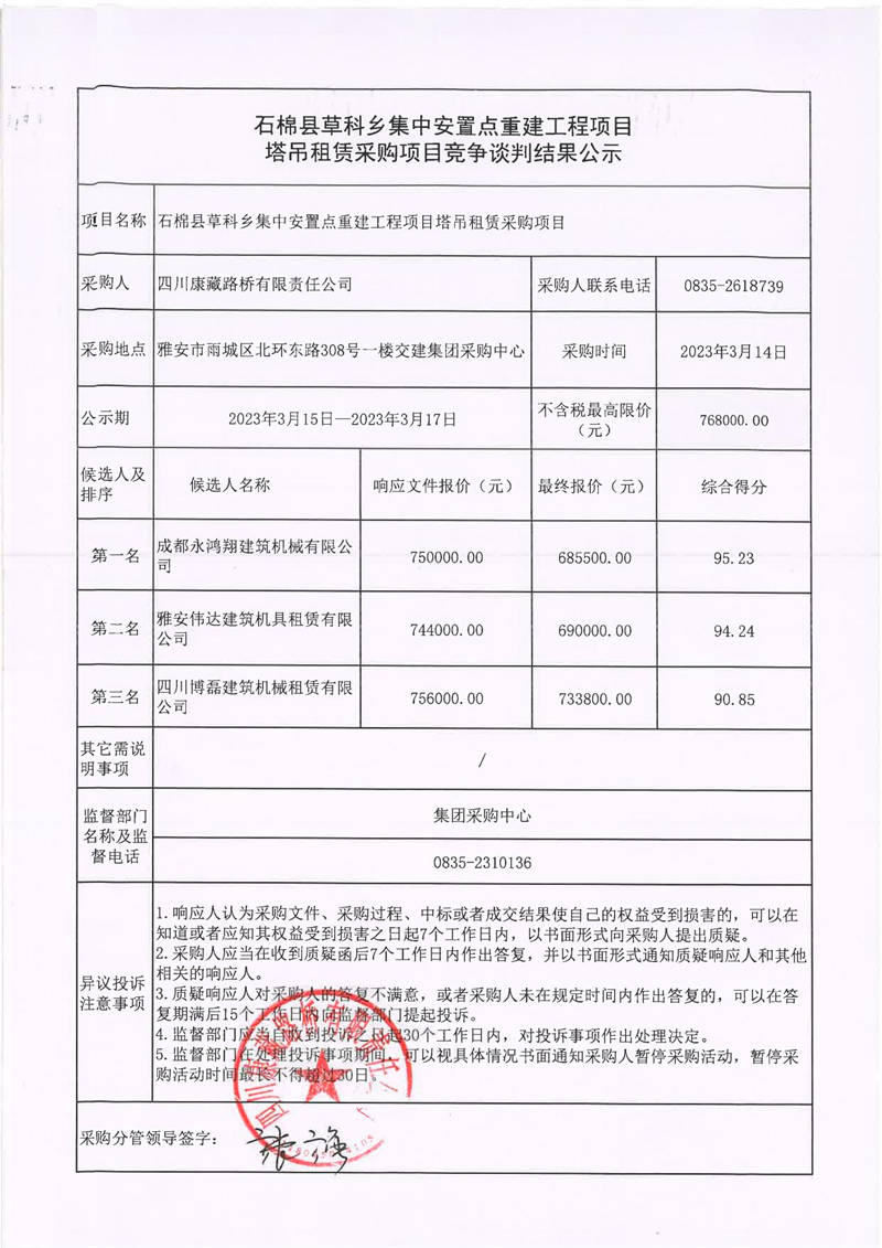 四川康藏路桥有限责任公司石棉草科乡集中安置点重建工程项目塔吊租赁采购竞争谈判结果公示