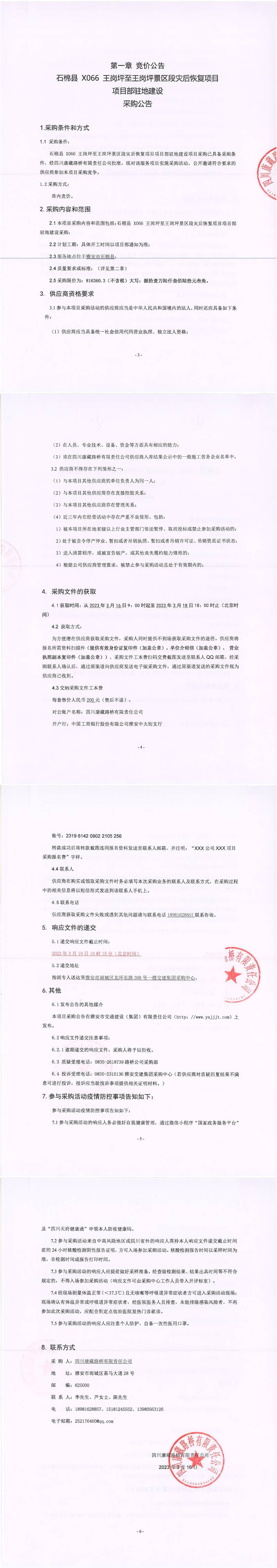 四川康藏路桥有限责任公司石棉县X066王岗坪至王岗坪景区灾后恢复项目项目部驻地建设采购公告