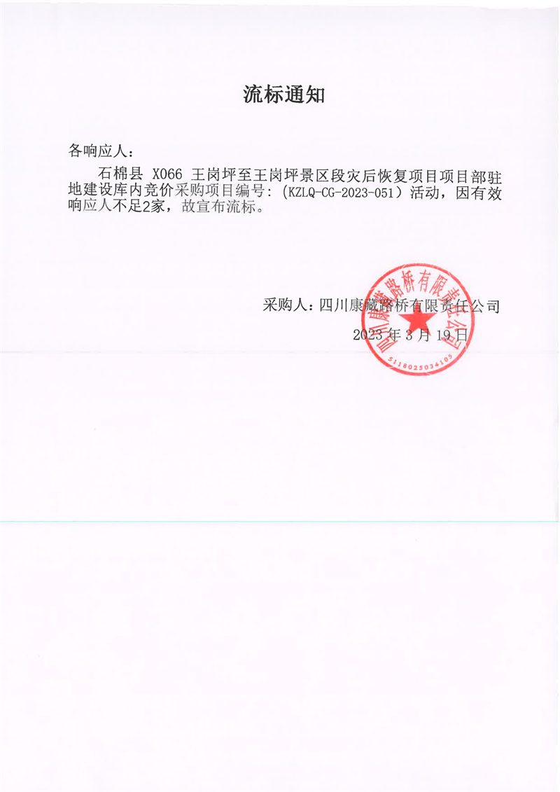 四川康藏路桥有限责任公司石棉县X066王岗坪至王岗坪景区段灾后恢复项目项目部驻地建设库内竞价采购流标通知