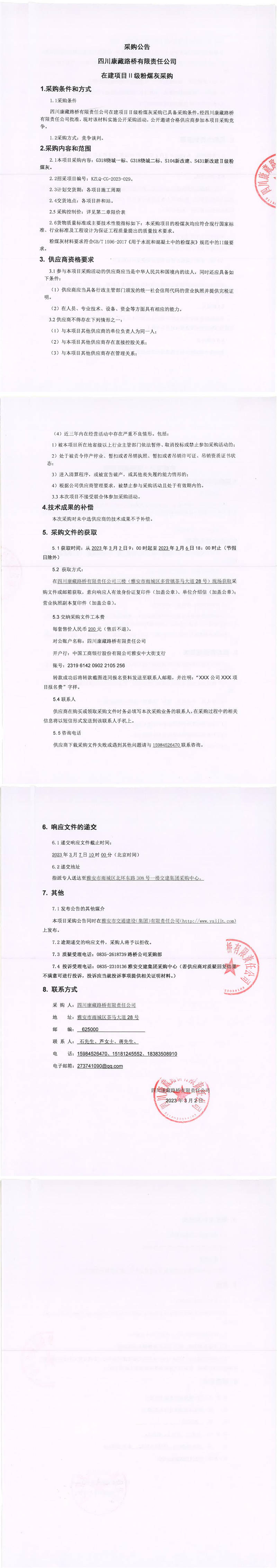 四川康藏路桥有限责任公司在建项目Ⅱ级粉煤灰采购公告