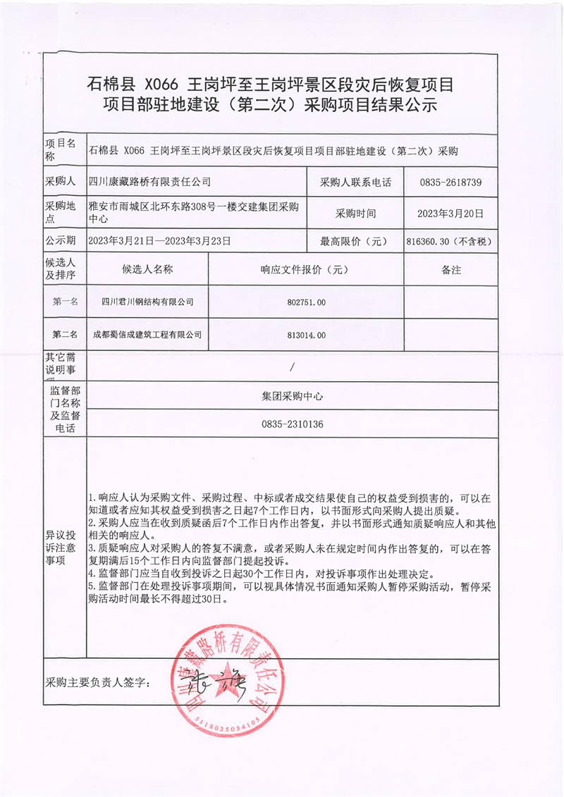 四川康藏路桥有限责任公司石棉县X066王岗坪至王岗坪景区段灾后恢项目项目驻地建设(第二次)采购结果公示