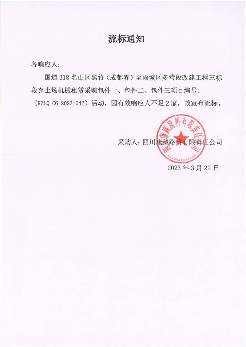 四川康藏路桥有限责任公司国道318名山区黑竹(成都界)至雨城区多营段改建工程三标段弃土场机械租赁采购流标通知