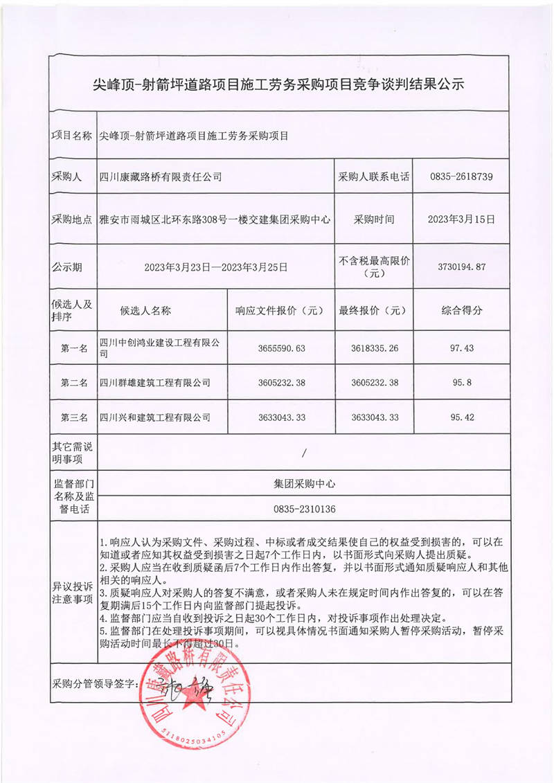 四川康藏路桥有限责任公司尖峰顶-射箭坪道路项目施工劳务采购项目竞争谈判结果公示
