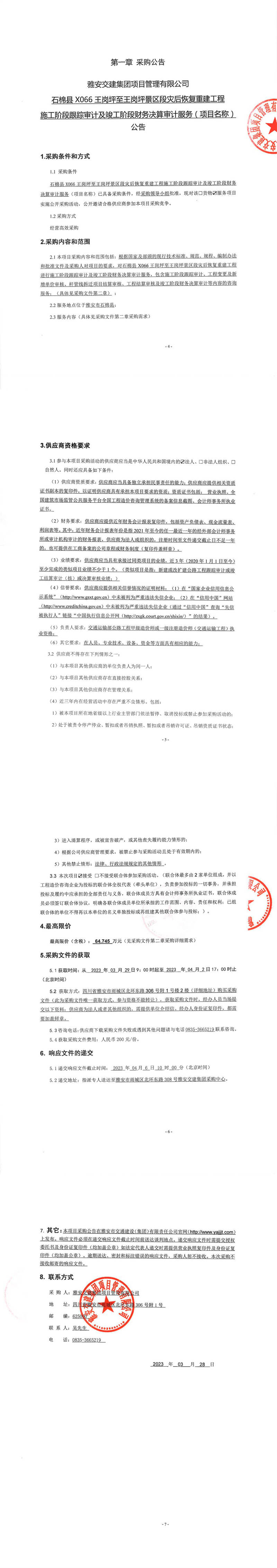 米兰体育-米兰(中国)官网 项目管理有限公司石棉县X066王岗坪至王岗坪景区段灾后恢复重建工程施工阶段跟踪审计及竣工阶段财务决算审计服务(项目名称)公告