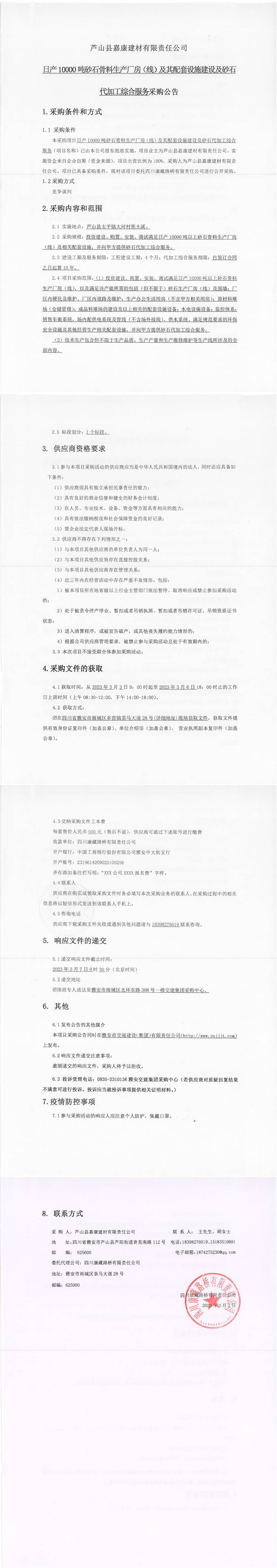 芦山县嘉康嘉康建材有限责任公司日产10000吨砂石骨料生产厂房(线)及其配套设施建设及砂石代加工综合服务采购公告