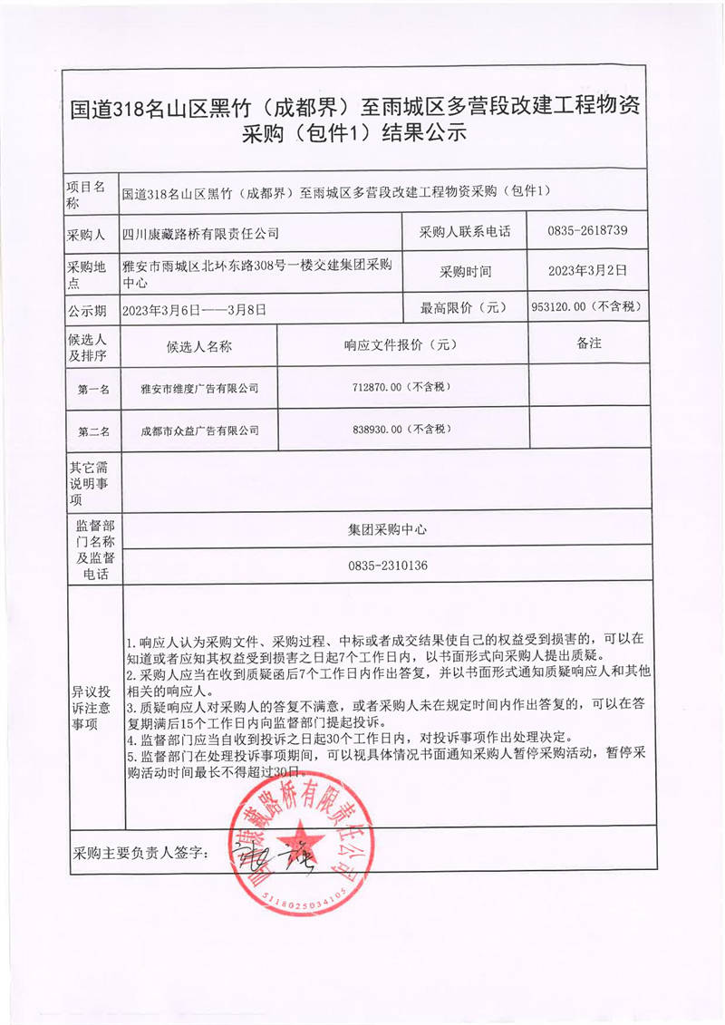 四川康藏路桥有限责任公司国道318名山区黑竹(成都界)至雨城区多营段改建工程物资采购(包件1)结果公示
