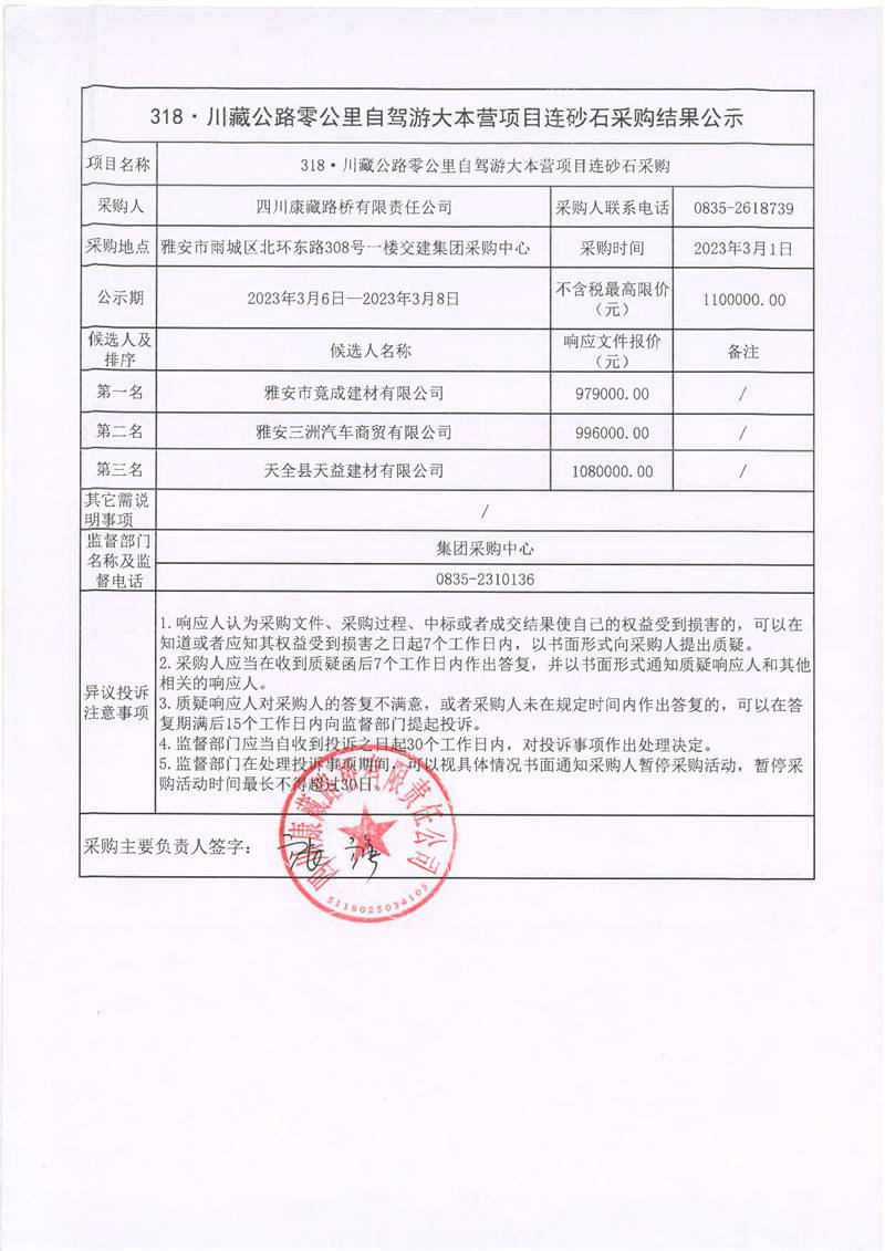 四川康藏路桥有限责任公司318·川藏公路零公里自驾游大本营项目连砂石采购结果公示