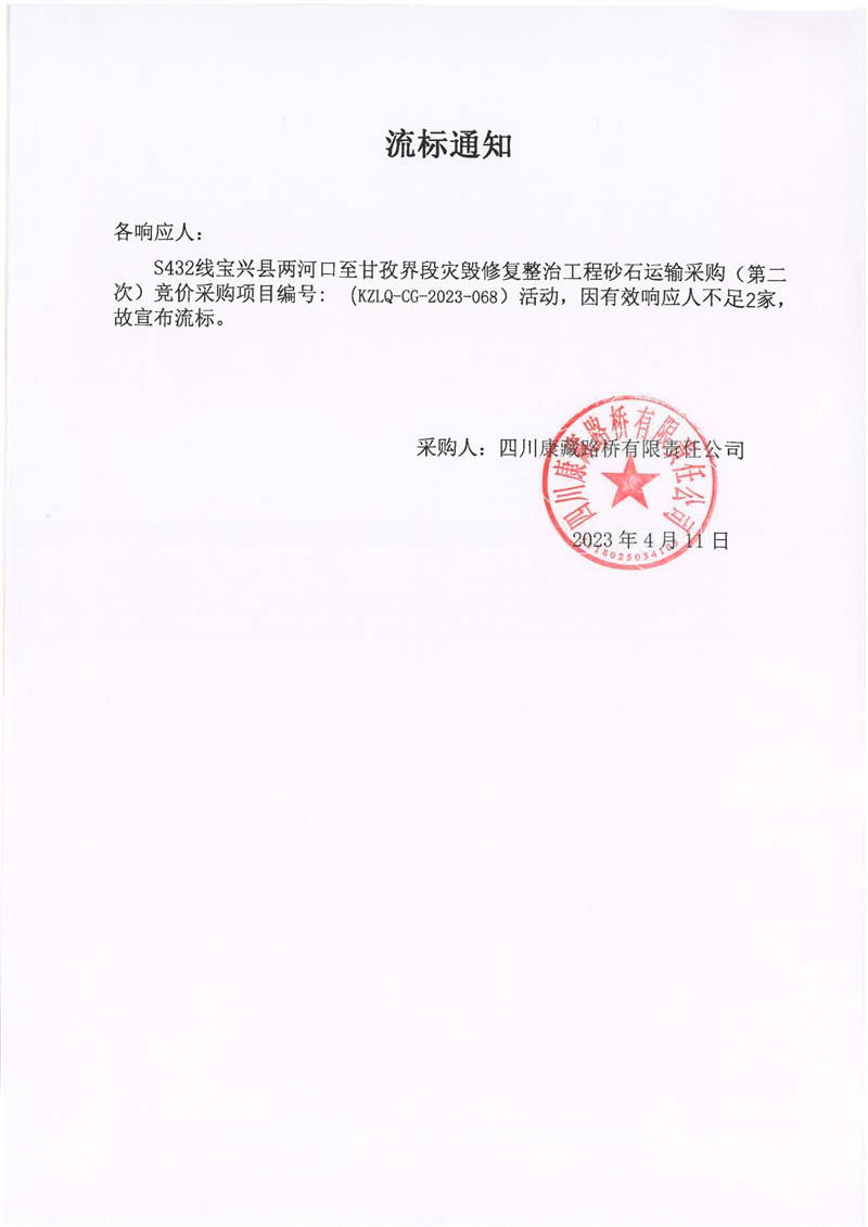 四川康藏路桥有限责任公司宝兴分公司S432宝兴县两河口至甘孜界段灾毁修复整治工程砂石运输采购(第二次)流标通知
