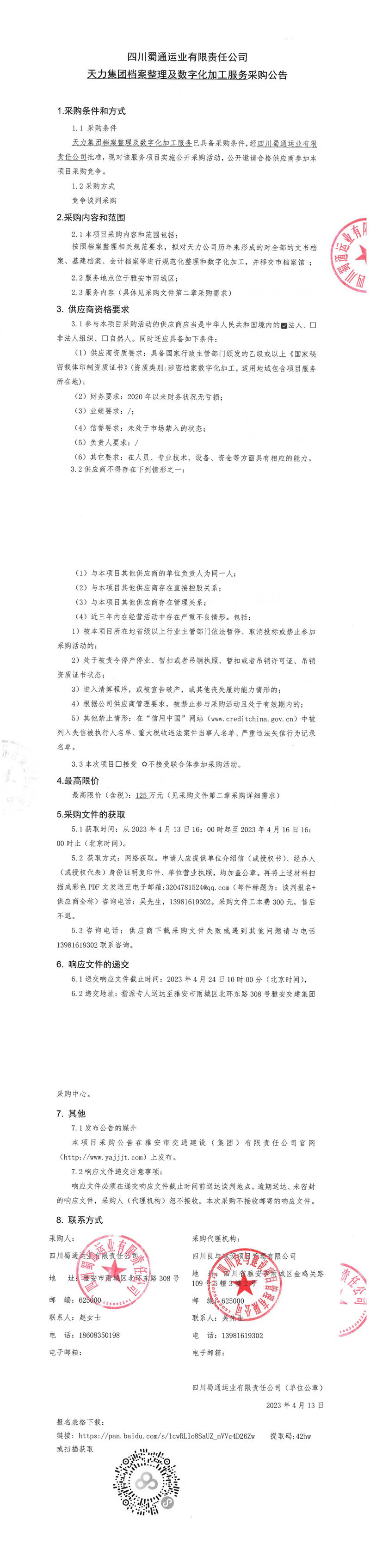 四川蜀通运业有限责任公司天力集团档案整理及数字化加工服务采购公告