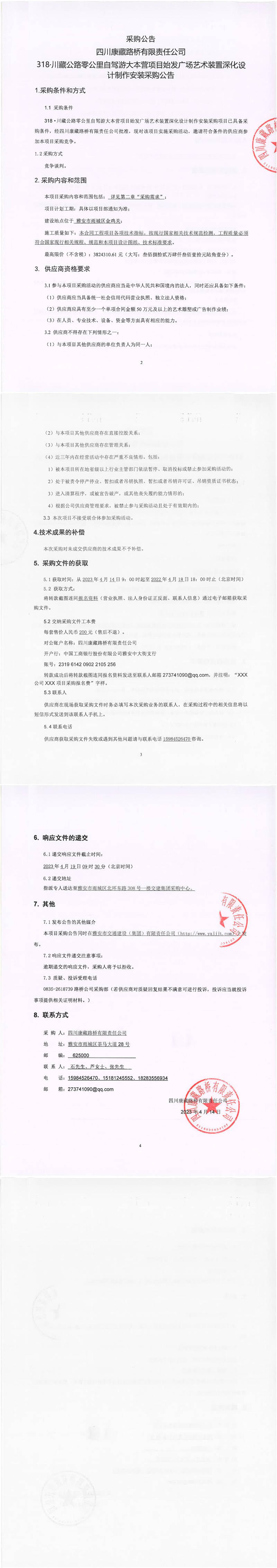 四川康藏路桥有限责任公司318·川藏公路零公里自驾游大本营项目始发广场艺术装置深化设计制作安装采购公告