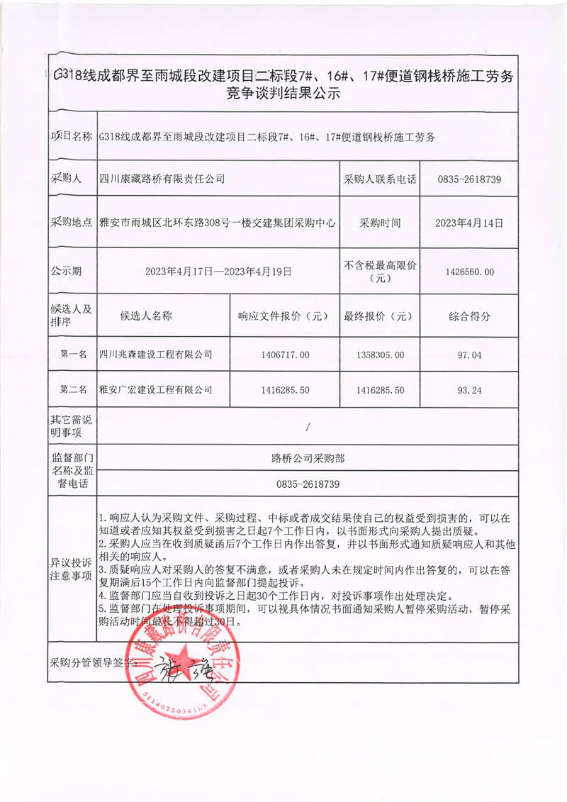 四川康藏路桥有限责任公司G318线成都至雨城段改建项目二标段7#、16#、17#便道钢栈桥施工劳务竞争谈判结果公示
