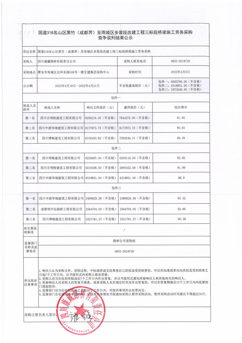四川康藏路桥有限责任公司国道318名山区黑竹(成都界)至雨城区多营段改建工程三标段桥梁施工劳务采购竞争谈判结果公示