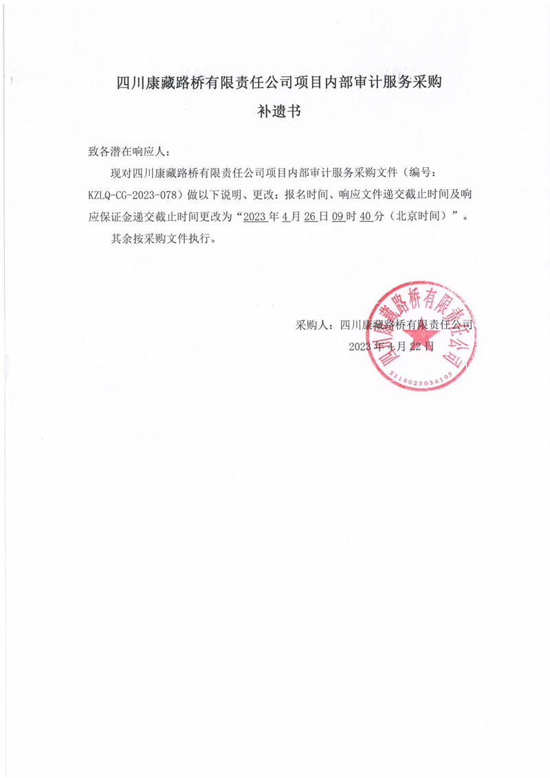 四川康藏路桥有限责任公司项目内部审计服务采购补遗书