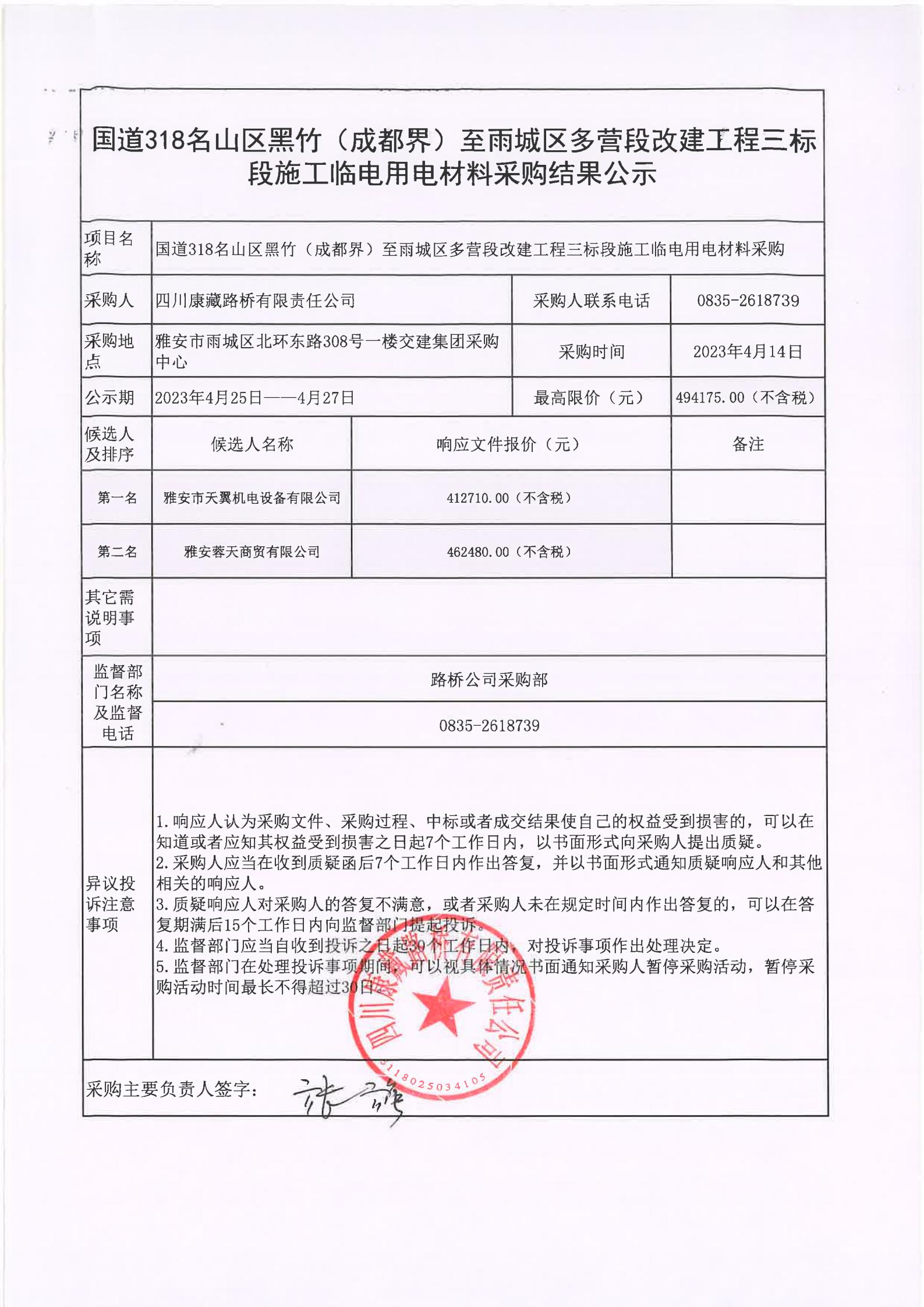 四川康藏路桥有限责任公司国道318名山区黑竹(成都界)至雨城区多营段改建工程三标段施工临电用电材料采购结果公示