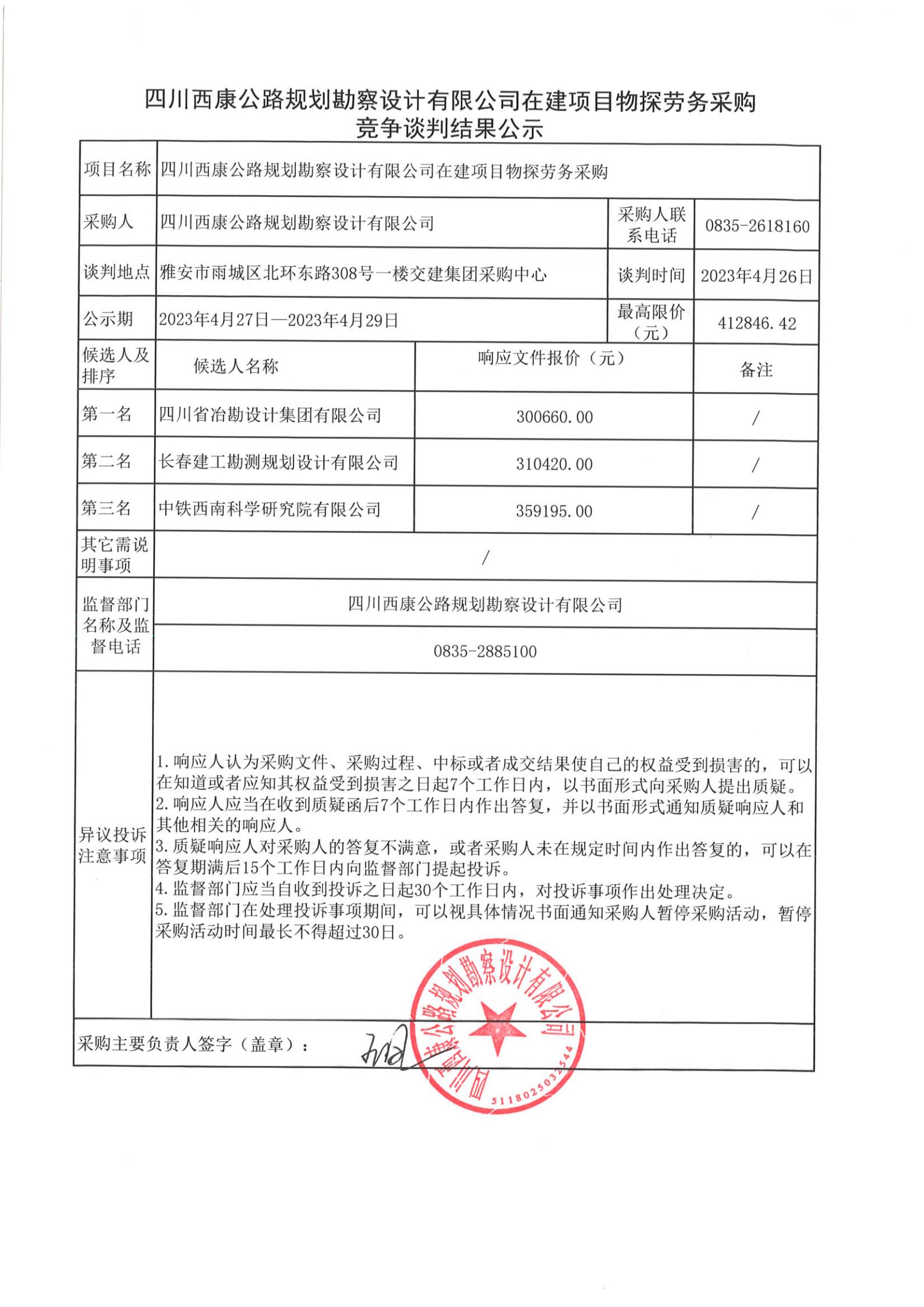 四川西康公路规划勘察设计有限公司在建项目物探劳务采购竞争谈判结果公示