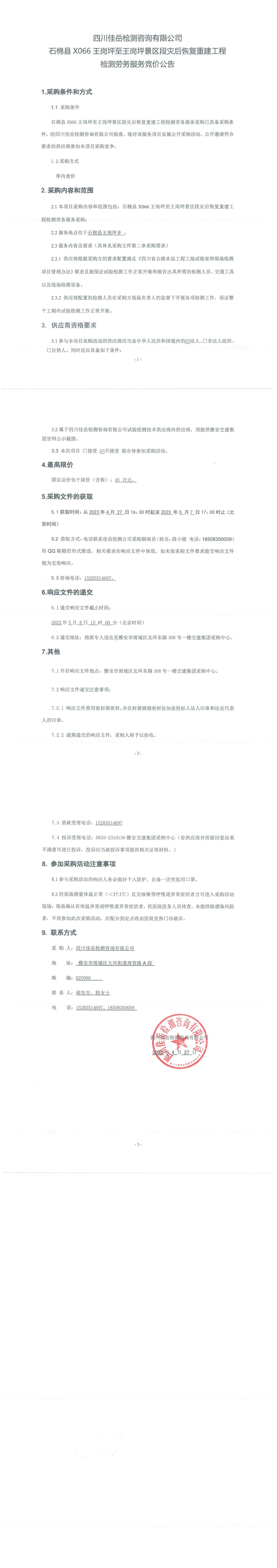 四川佳岳检测咨询有限公司石棉县X066王岗坪至王岗坪景区段灾后恢复重建工程检测劳务服务竞价公告