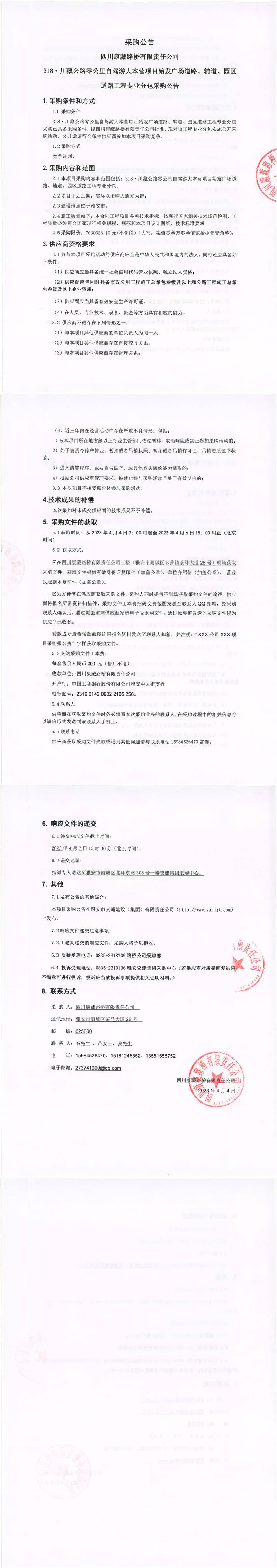 四川康藏路桥有限责任公司318·川藏公路零公里自驾游大本营项目始发广场道路、辅道、园区道路工程专业分包采购公告