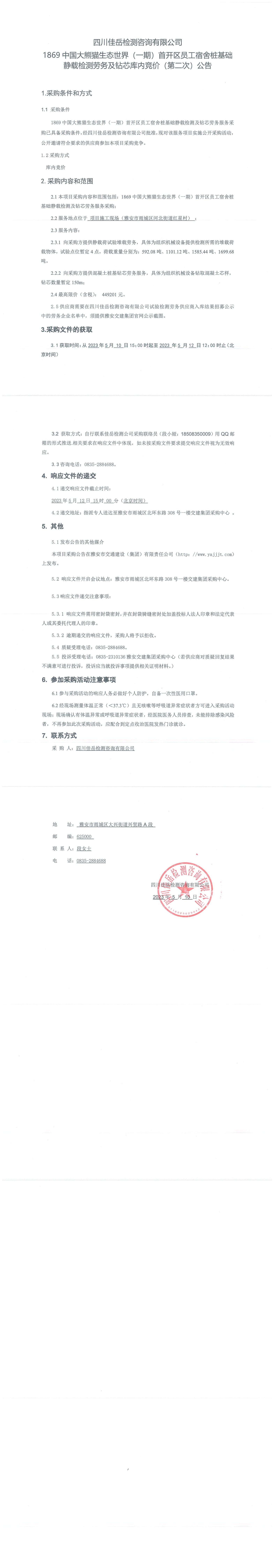 四川佳岳检测咨询有限公司1869中国大熊猫生态世界(一期)首开区员工宿舍桩基础静载检测劳务及砖芯库内竞价(第二次)采购公告