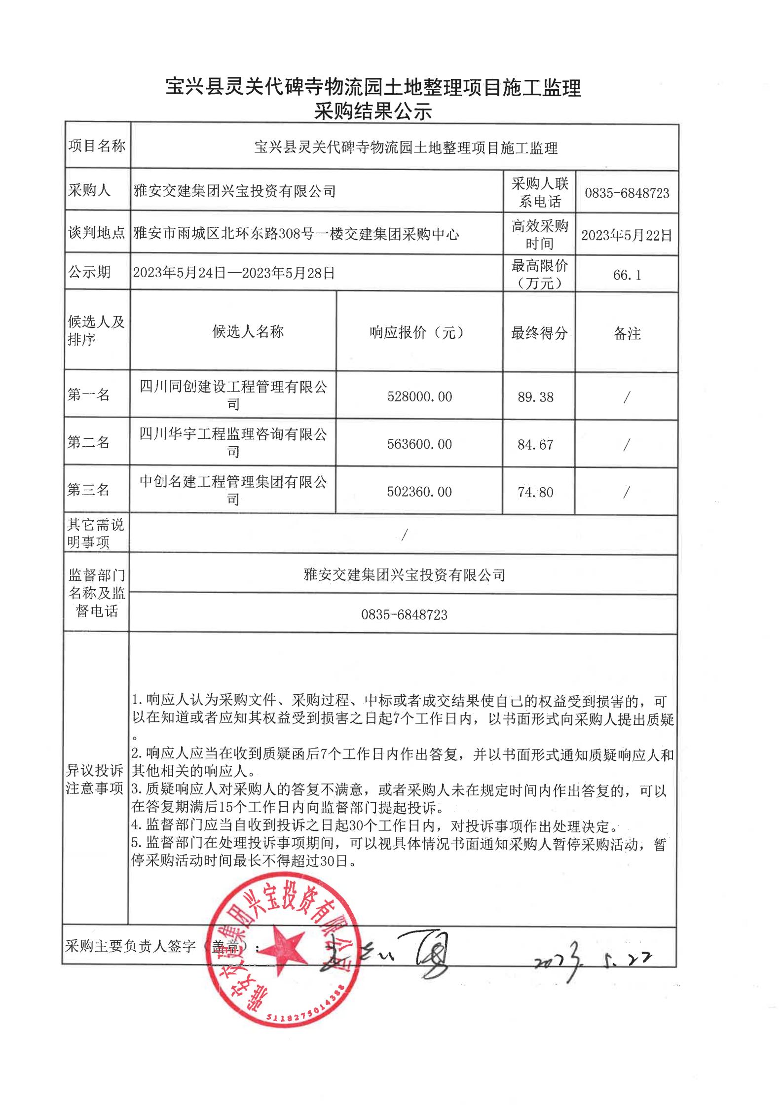 米兰体育-米兰(中国)官网 兴宝投资有限公司宝兴县灵关代碑寺物流园土地整理项目施工监理采购结果公示