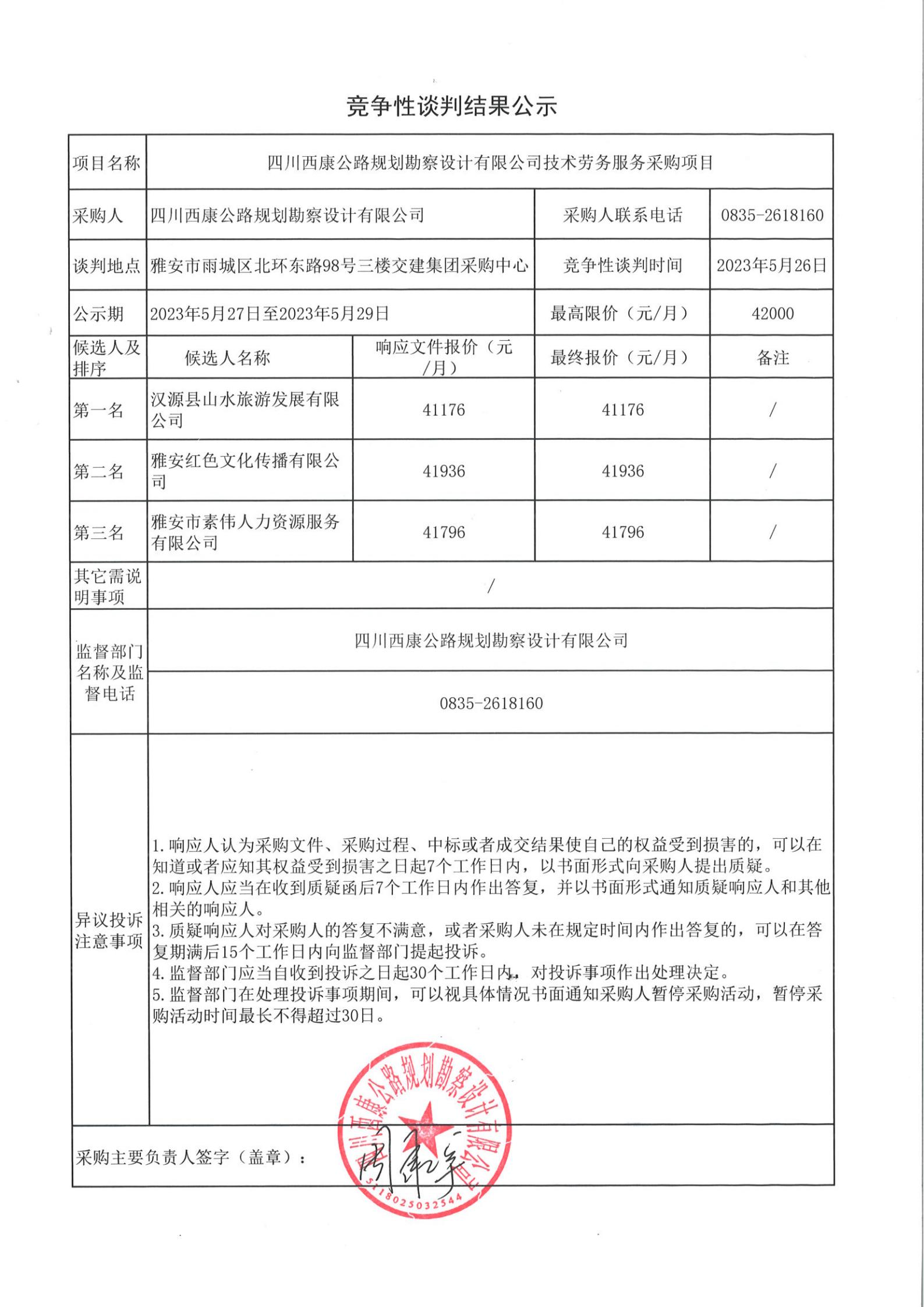 四川西康公路规划勘察设计有限公司技术劳务服务采购结果公示