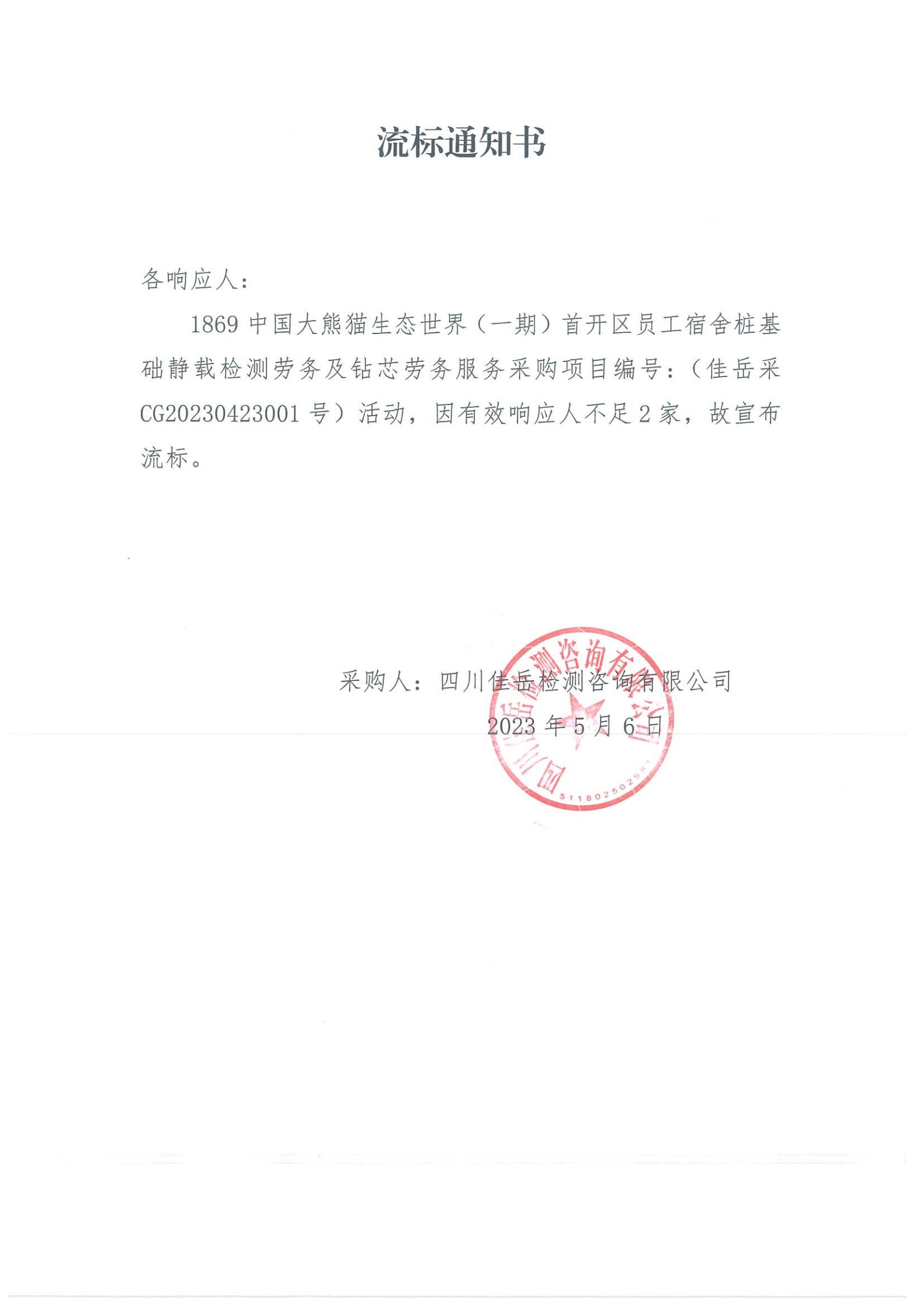 四川佳岳检测咨询有限公司1869中国大熊猫生态世界(一期)首开区员工宿舍桩基础静载检测劳务及砖芯库劳务服务流标通知