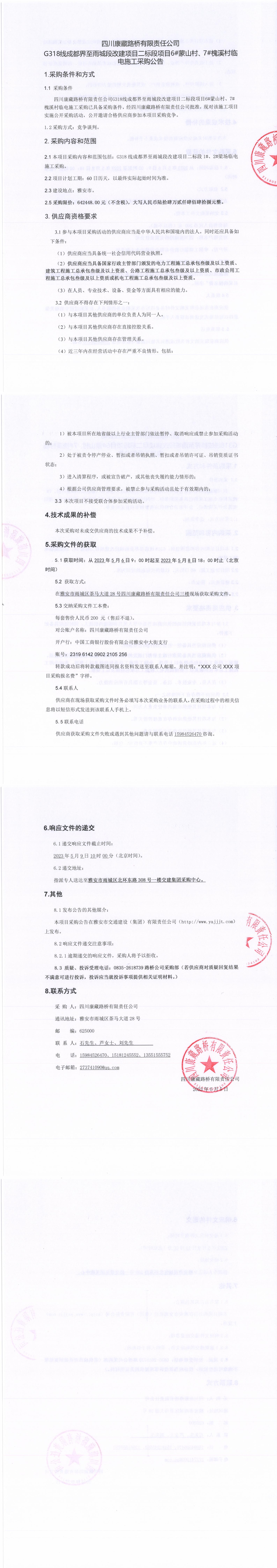 四川康藏路桥有限责任公司G318线成都至雨城段改建项目二标段项目6#蒙山村、7#槐溪村临时电施工采购公告