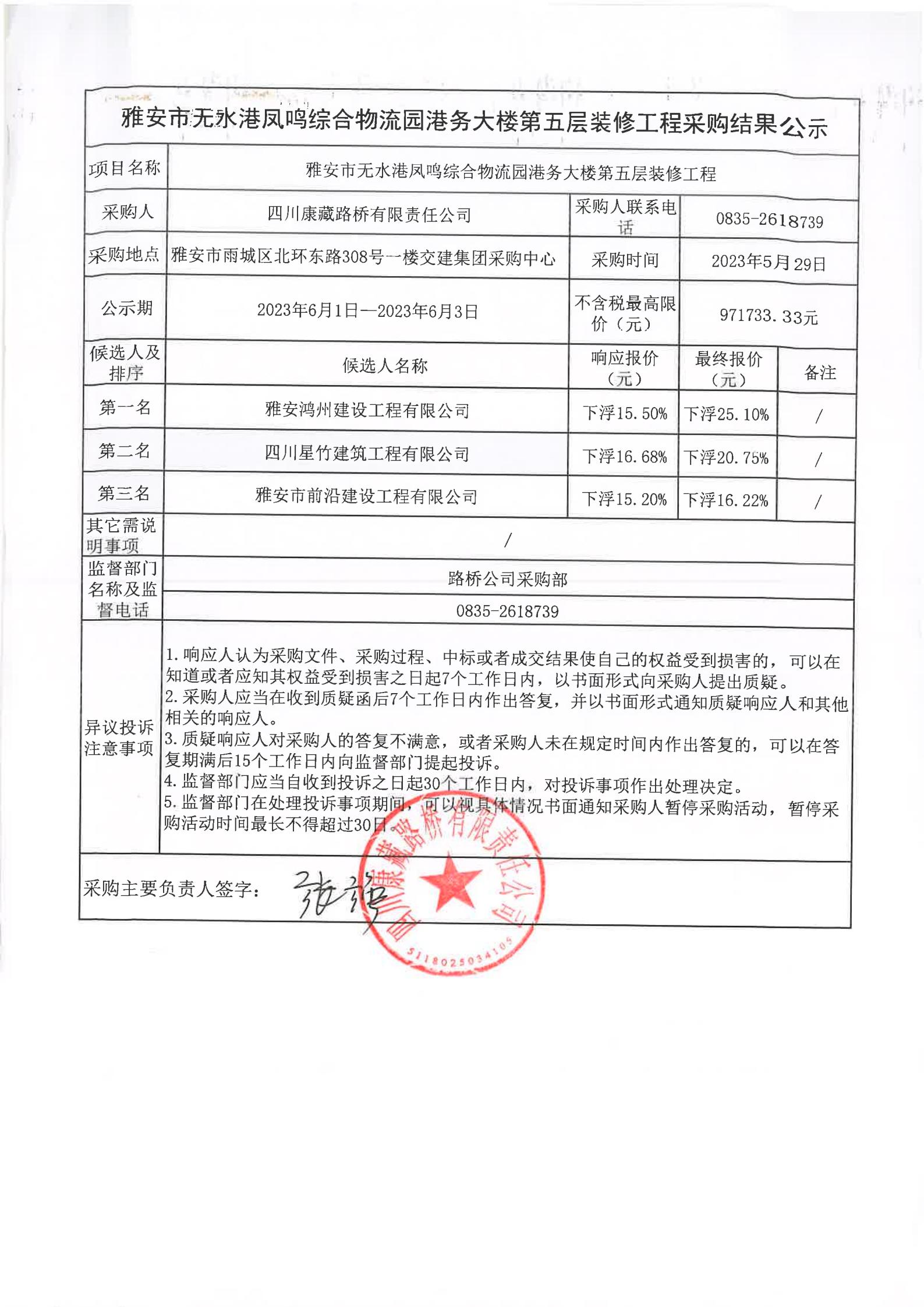 四川康藏路桥有限责任公司雅安市无水港凤鸣综合物流园港务大楼第五层装修工程采购结果公示