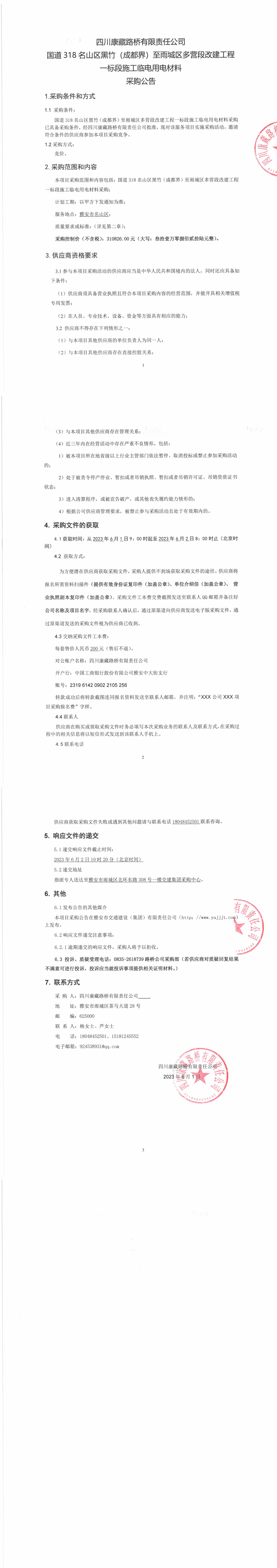 四川康藏路桥有限责任公司国道318名山区黑竹(成都界)至雨城区多营段改建工程一标段施工临电用电材料采购公告