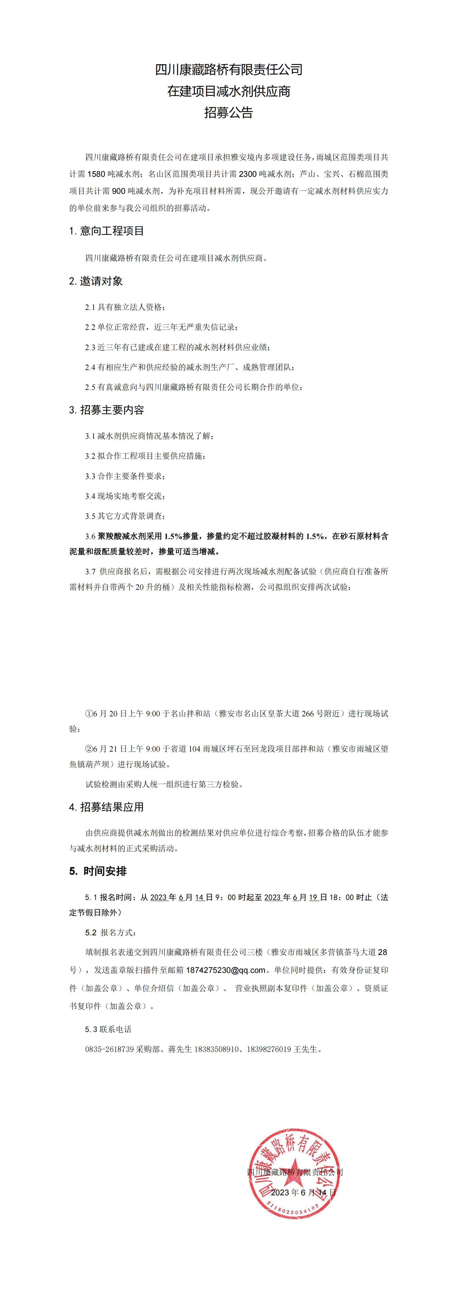 四川康藏路桥有限责任公司在建项目减水剂供应商招募公告