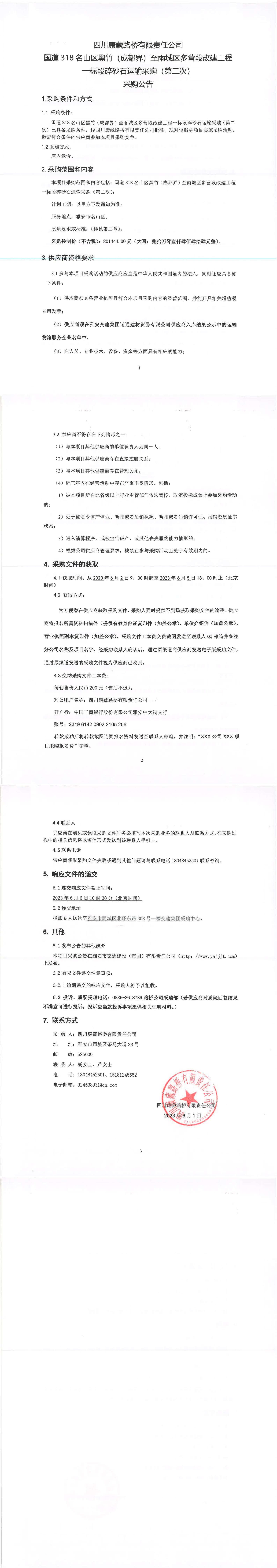 四川康藏路桥有限责任公司国道318名山区黑竹(成都界)至雨城区多营段改建工程一标段碎砂石运输采购(第二次)采购公告