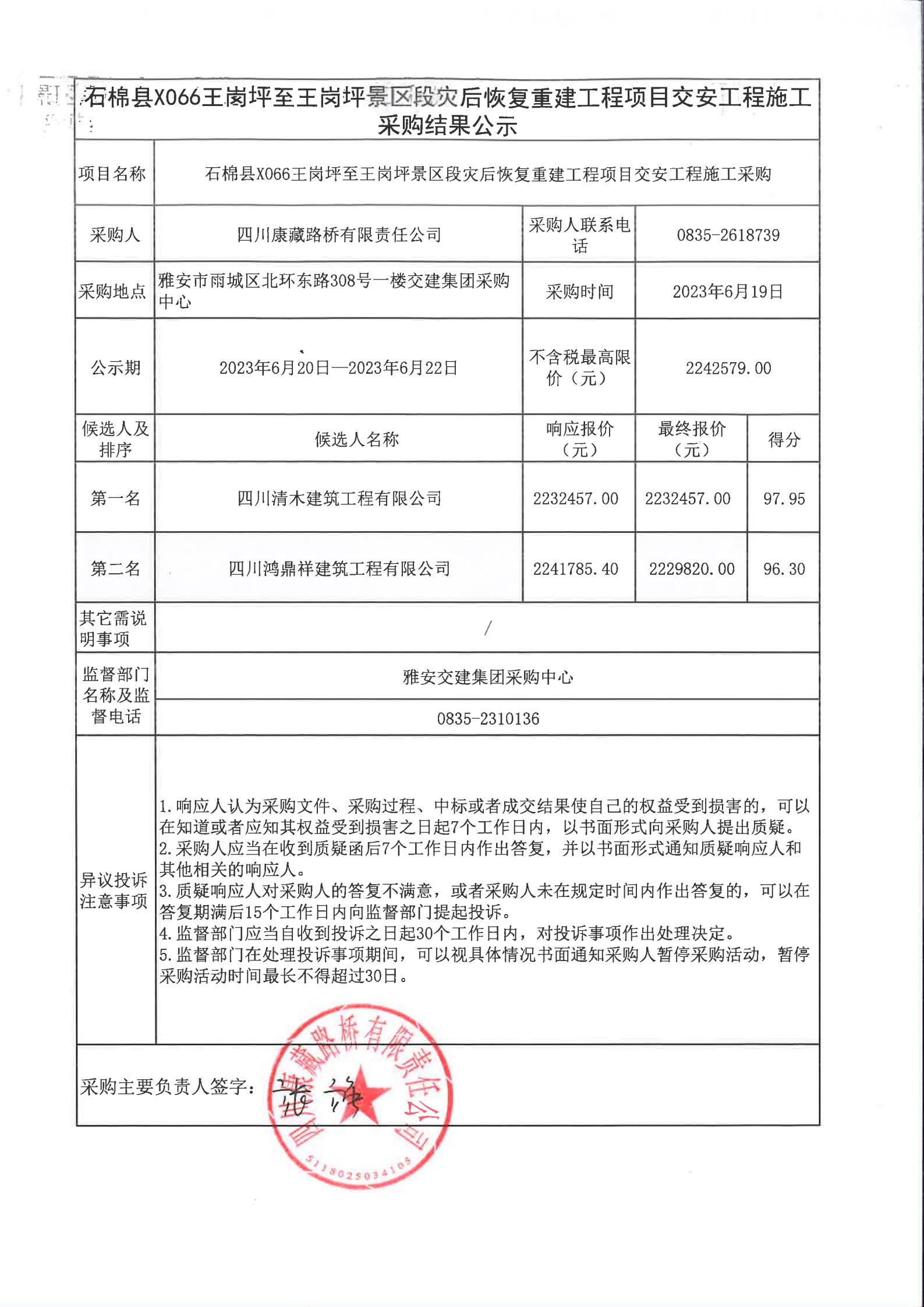 四川康藏路桥有限责任公司石棉县X066王岗坪至王岗坪景区段灾后恢复重建工程项目交安工程施工采购结果公示
