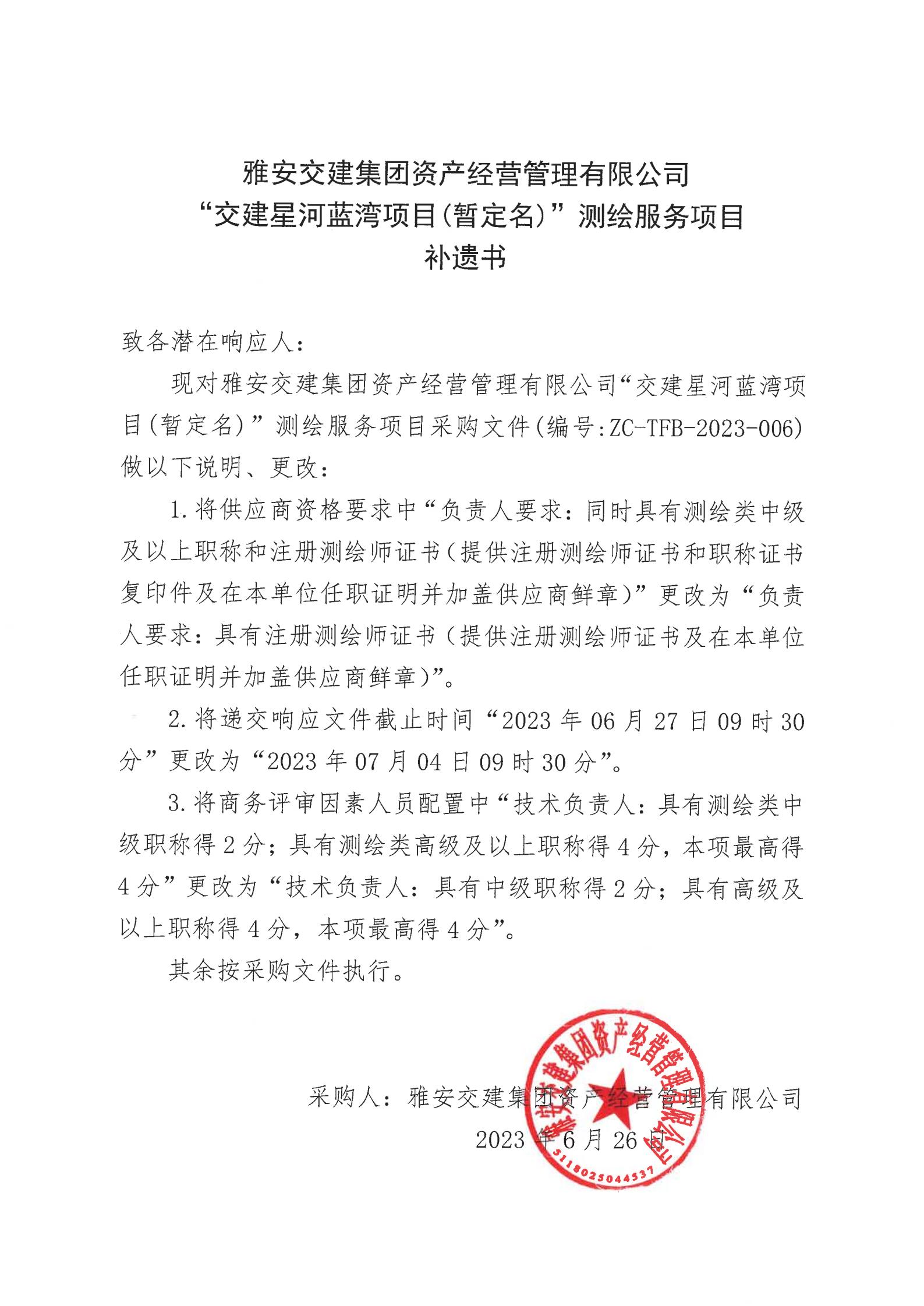 米兰体育-米兰(中国)官网 资产经营管理有限公司“交建星河蓝湾项目(暂定名)”测绘服务项目补遗书