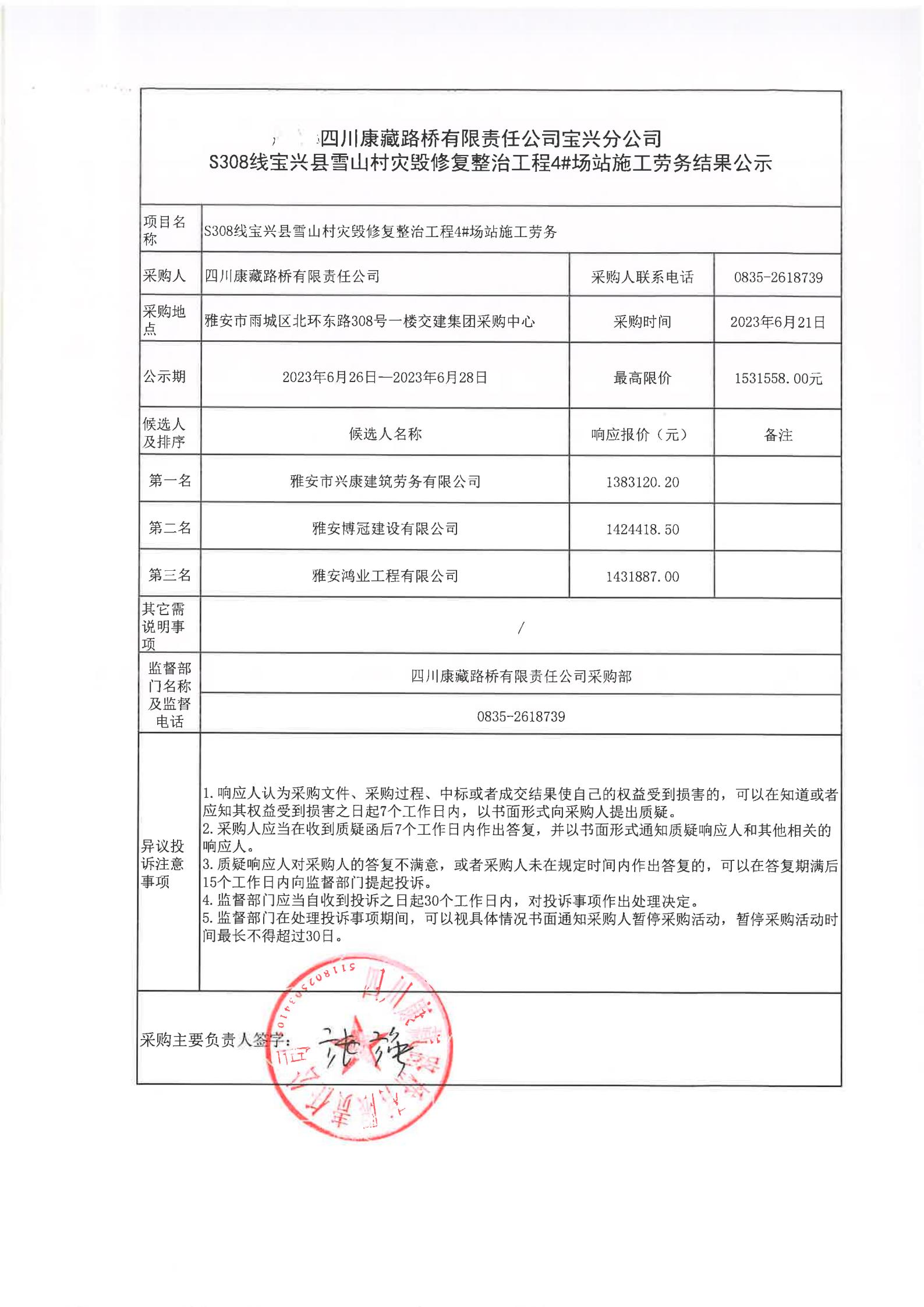四川康藏路桥有限责任公司宝兴分公司S308线宝兴县雪山村段灾毁修复整治工程4#场站施工劳务结果公示