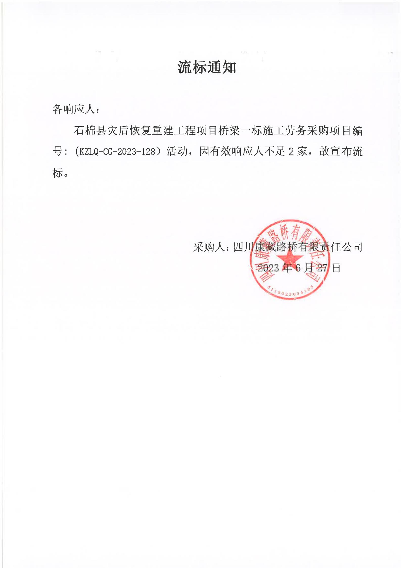 四川康藏路桥有限责任公司石棉县灾后恢复重建工程项目桥梁一标施工劳务采购流标通知