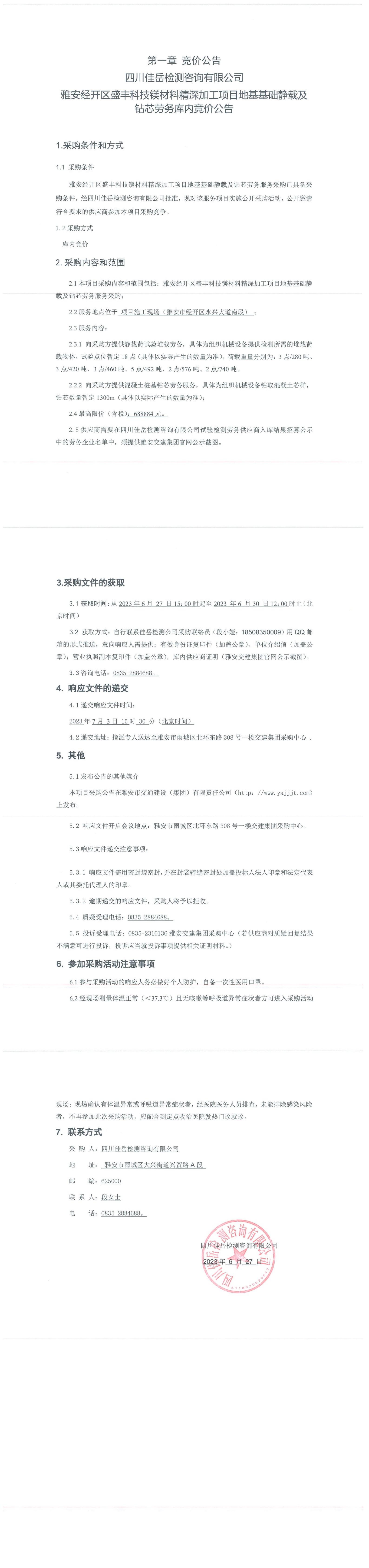 四川佳岳检测咨询有限公司雅安经开区盛丰科技镁材料精深加工项目地基基础静载及钻芯劳务库内竞价公告